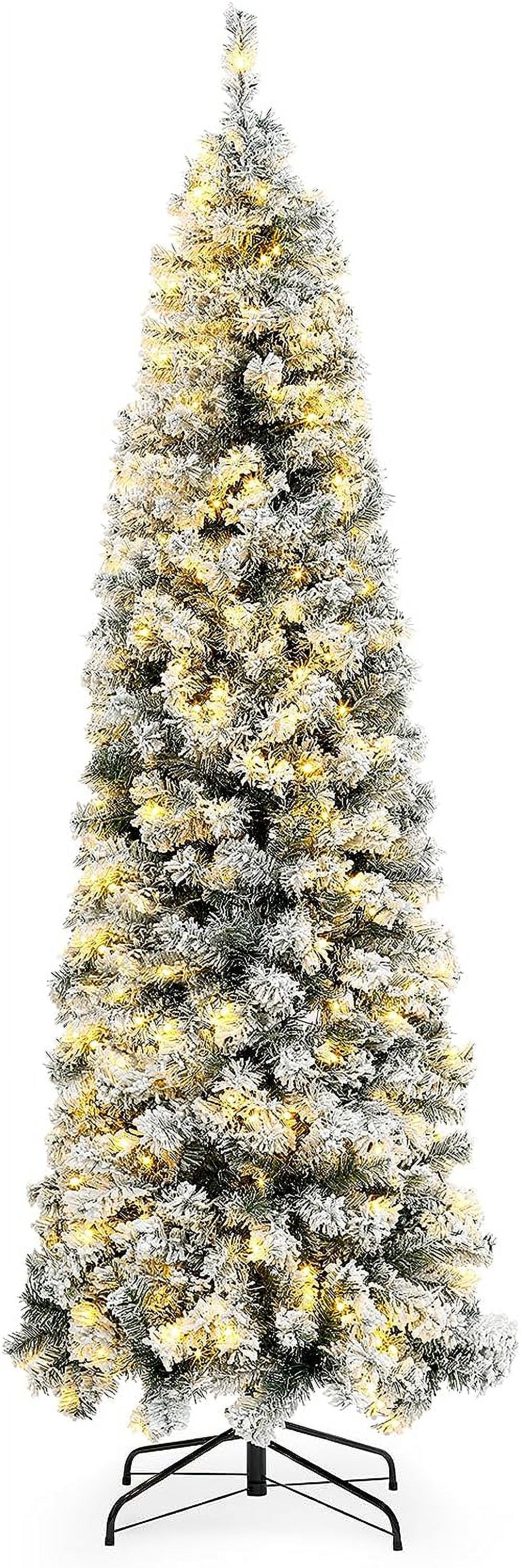 Funcid 6Ft Pencil Christmas Tree Pre-Lit Artificial Snow Flocked Slim Skinny Christmas Tree Holiday Decoration w/250 Warm Lights