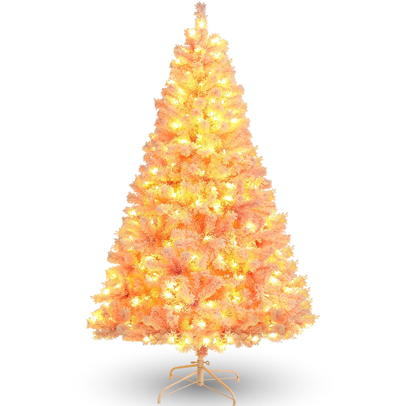 VIBESPARK 6FT Pre-Lit Flocked Christmas Tree, Artificial Christmas Tree with 250 LED Lights, Hinged Pine Tree with 640 Branches, Foldable Metal Stand, Indoor and Outdoor, Pink