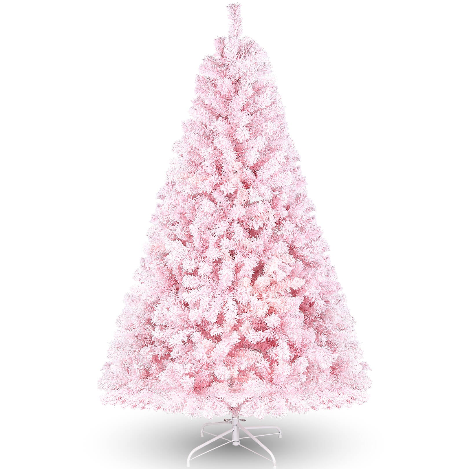 VIBESPARK 6FT Snow Flocked Christmas Tree, Artificial Imitation Christmas Tree, Hinged Pine Tree with 640 Branches, Foldable Metal Stand, Holiday Decorations, Indoor and Outdoor, Pink