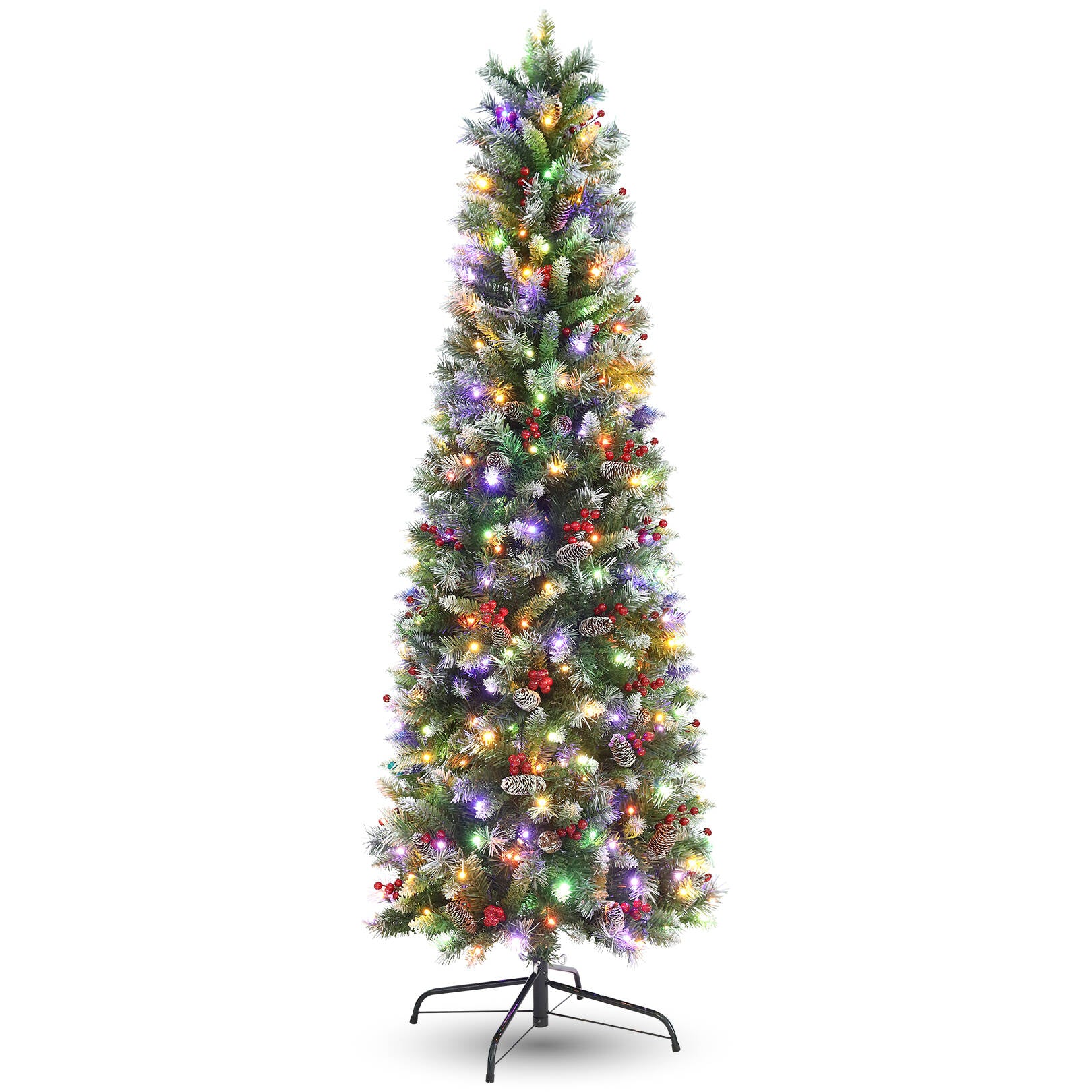 VIBESPARK 6FT Pre-Lit Pre-Decorated Pencil Christmas Tree, Flocked Frosted Hinged Christmas Tree with 566 PVC Branches, Skinny Xmas Tree, 250 Led Lights, 49 Pine Cones & Berries, Foldable Metal Stand