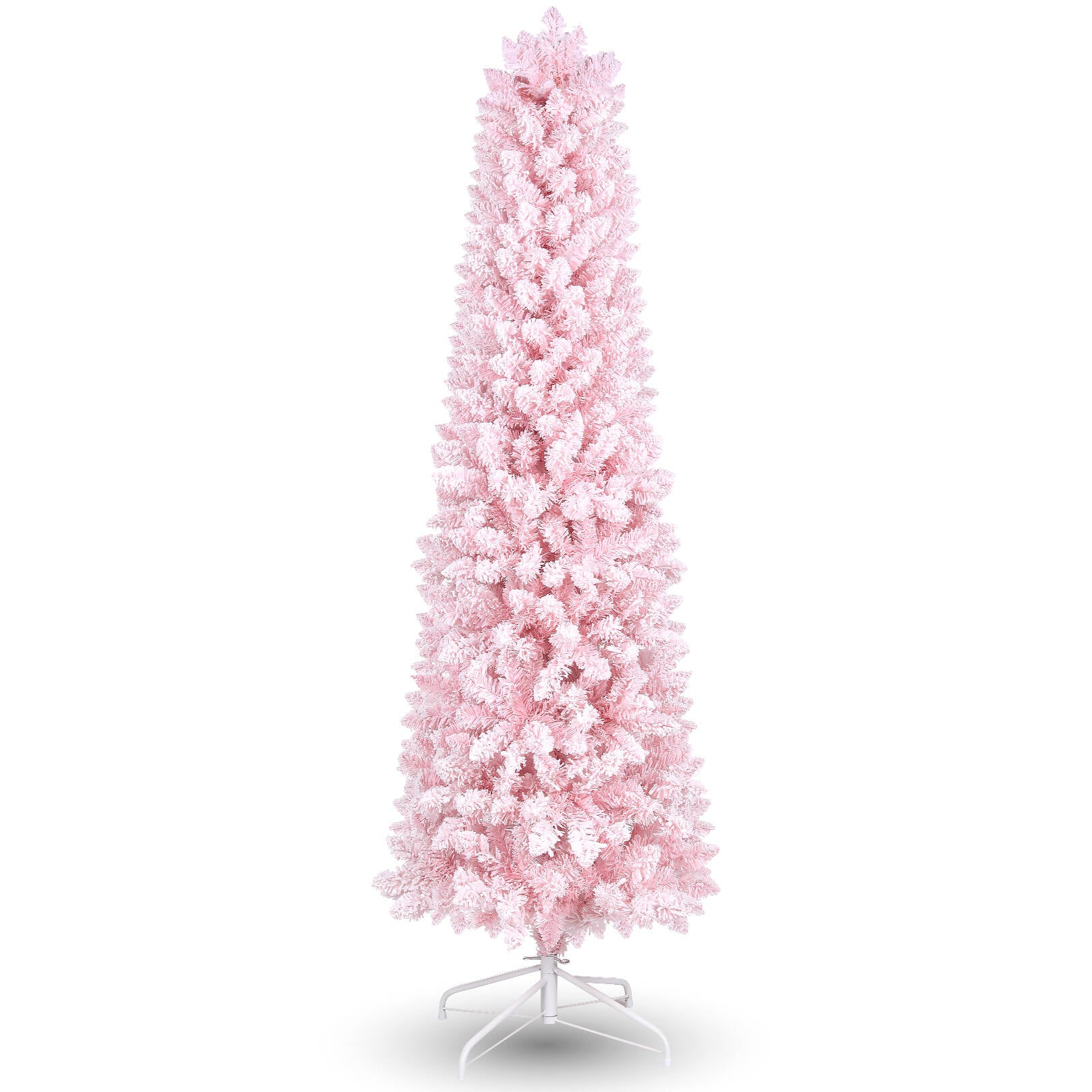 VIBESPARK 6FT Pencil Snow Flocked Christmas Tree, Hinged Pine Tree with 566 PVC Branches, Skinny Xmas Tree, Foldable Metal Stand, Holiday Decorations, Indoor and Outdoor, Pink